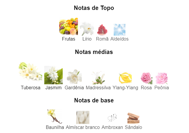 Notas: As notas de topo são Frutas, Lírio, Romã e Aldeídos; as notas de coração são Tuberosa, Jasmim, Gardênia, Madressilva, Ylang-Ylang, Rosa e Peônia; as notas de base são Baunilha, Almíscar Branco, Ambroxan e Sândalo.